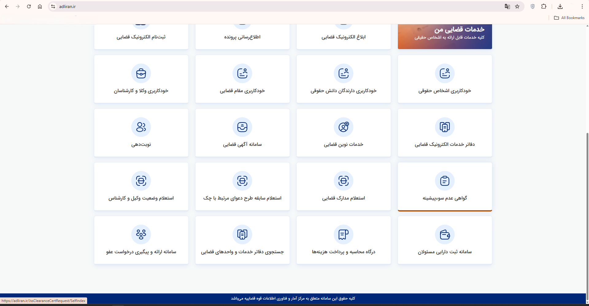 - از بخش «خدمات الکترونیک قضایی» گزینه گواهی عدم سوءپیشینه را انتخاب کنید.