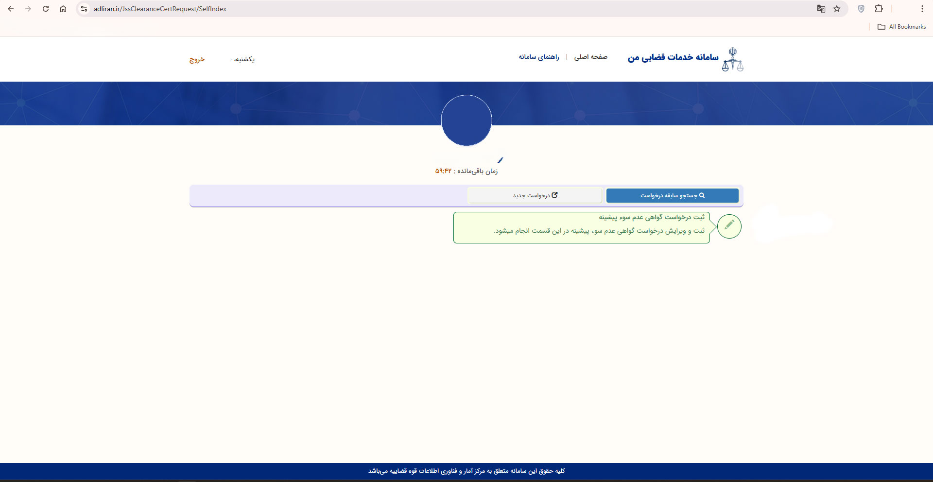 پس از تأیید اطلاعات، ورود شما به سامانه با موفقیت انجام شده و به پنل کاربری منتقل خواهید شد. از این بخش میتوانید فرآیند ثبت اینترنتی گواهی عدم سوءپیشینه را ادامه دهید.