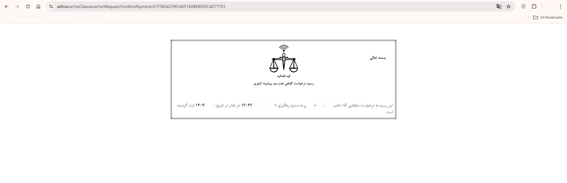 در صورت انجام موفق پرداخت، رسید الکترونیکی برای شما صادر میشود و درخواست صدور گواهی عدم سوءپیشینه به صورت نهایی در سامانه ثبت خواهد شد.